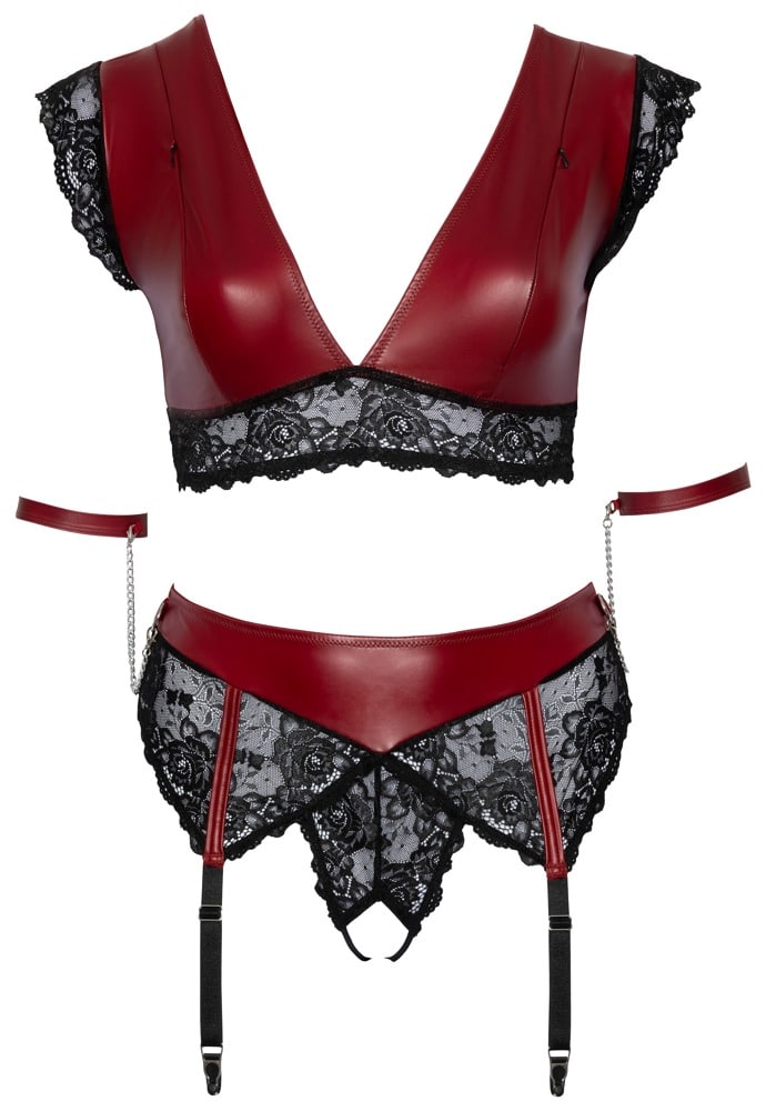 Bralette, Straps-String ouvert und 2 Armfesseln im Set von Cottelli BONDAGE PLUS im edlen roten Mattlook mit feiner schwarzer elastischer Spitze und silberfarbenen Metalldetails. Das tief dekolletierte Bralette bedeckt verführerisch den oberen Rücken und die Schultern. Bei dem Highwaist-String sind die Strumpfhalter fest angenäht und in der Länge passend verstellbar. Jeweils seitlich sind Ringe befestigt, in die die beiden Armfesseln mit ihren Karabinerketten eingehakt werden können. Die Fesselriemen sind mit ihren Klettverschlüssen schnell angelegt und passend verstellbar. Im Schritt ist der Straps-String offen.