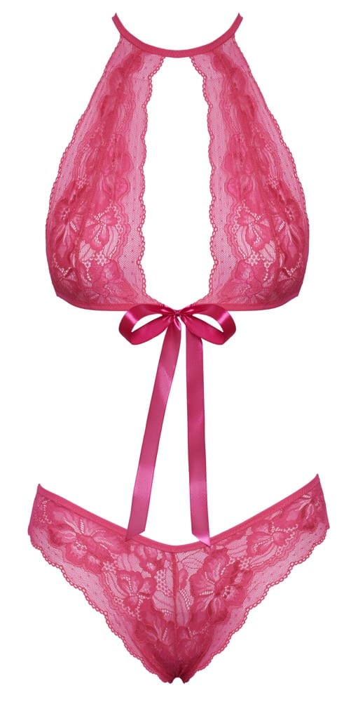 Frech verspieltes Set von kissable bestehend aus Soft-BH und Slip mit verführerischen Satin-Bindeschleifen – beim stylischen BH vorne, beim Slip in dem V-Ausschnitt über dem Po. Komplett aus feiner pinkfarbener Spitze gefertigt – rundum weich und elastisch für höchsten Tragekomfort. BH im Nacken und im Rücken mit Hakenverschluss.