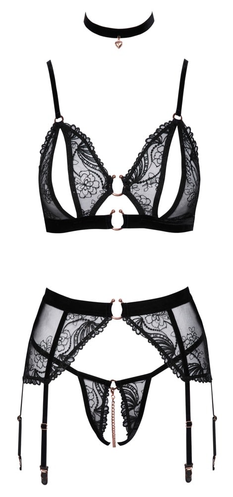 Soft-BH, Strapsgürtel und String ouvert vereint im elegant erotischen Straps-Set von Abierta Fina inklusive Samt-Halsband. Set aus feinem schwarzem Tüll gearbeitet, aufwendig bestickt und mit kleinen Pailletten verziert. Roségoldfarbene Accessoires und elastische Samtbänder runden das verführerische Styling ab. BH mit geschlitzten Soft-Cups, Hakenverschluss im Rücken und passend verstellbaren Samt-Trägern. Strapsgurt ebenfalls mit Hakenverschluss hinten und insgesamt 6 verstellbaren Samt-Strumpfhaltern. Der kleine String verführt mit einem komplett offenem Schritt und stimulierender Kette, die auch abgenommen werden kann. Das schöne Halsband aus Samt ist mit einem kleinen Schmuckherz verziert und mit seinem Klettverschluss passend verstellbar.