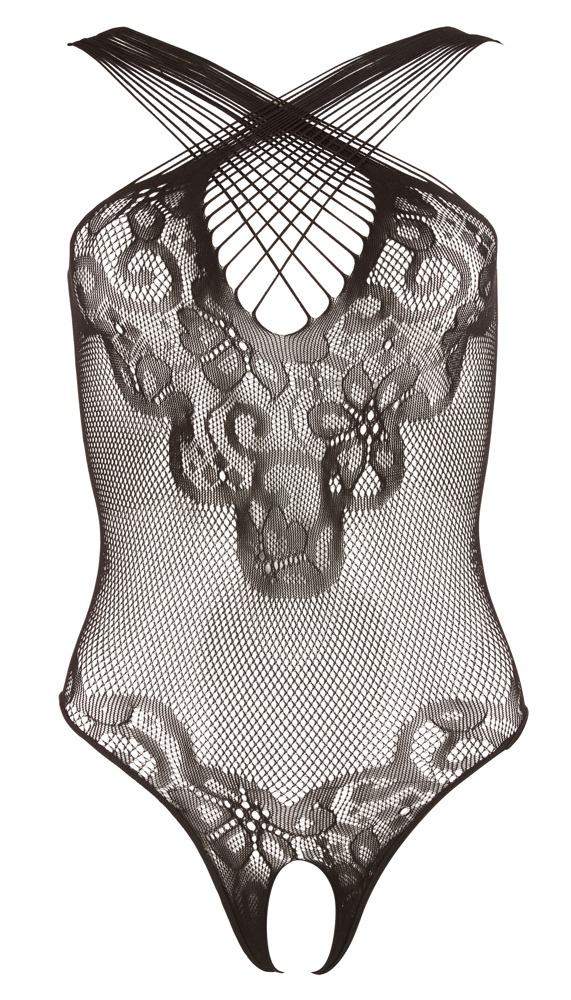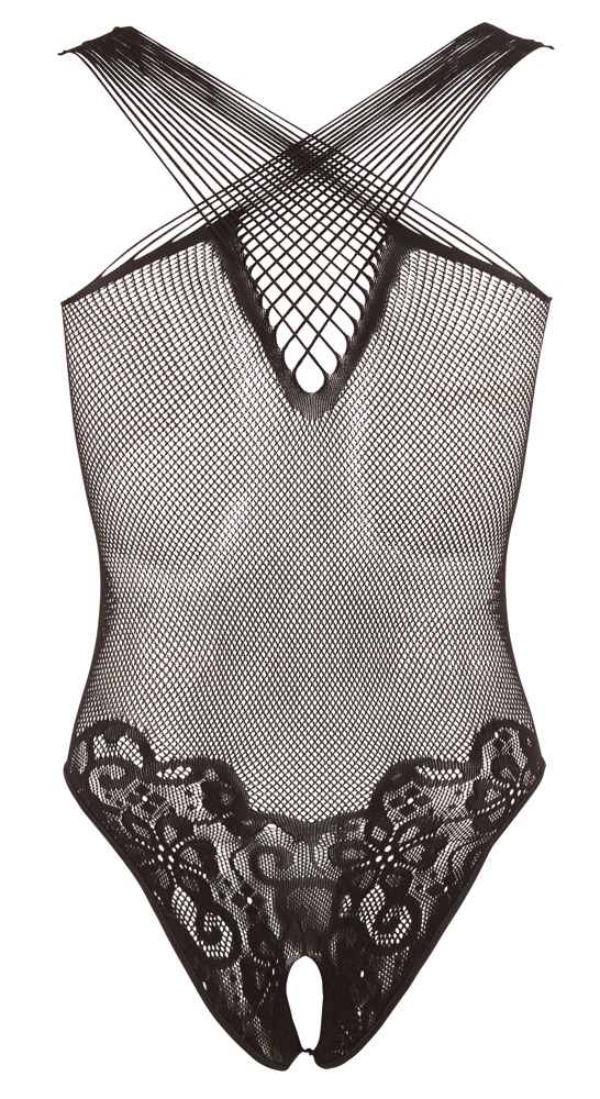 Nahtlos gefertigter Body in Netz- und Spitzenoptik mit einladend offenem Schritt. Die elastischen Träger können variabel auch über Kreuz getragen werden.