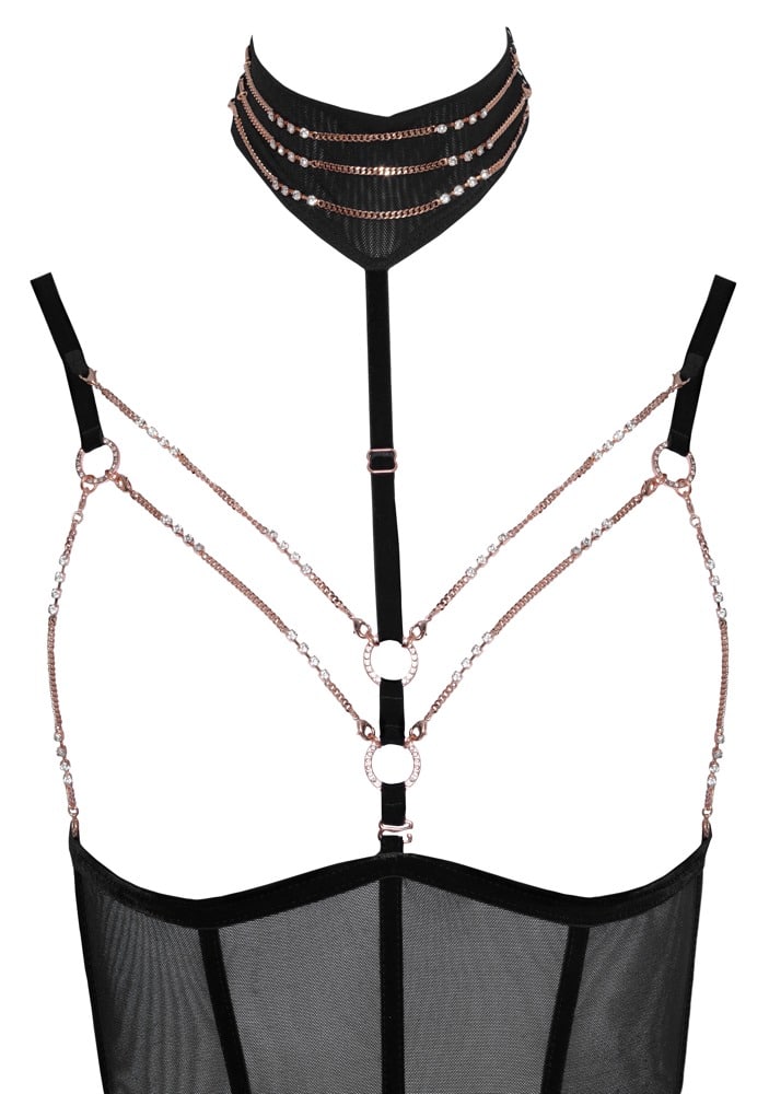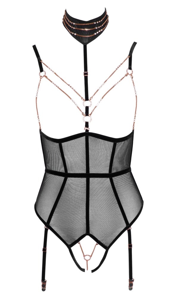 Busenfreier Body von Abierta Fina mit komplett offenem Schritt aus Powernet mit elastischen Samtstreifen und roségoldfarbenen Schmuckelementen. Träger und Strapse verstellbar, Strapse auch abnehmbar. Verstellbarer Dekolletésteg mit Ketten verziertem Halsband (mit Knopfverschluss) ebenfalls abnehmbar, genauso wie die mit kleinen Karabinern versehenen Brustketten und die mit dekorativem Ring versehene Schrittkette. Alle Ketten sind zusätzlich mit kleinen Strasssteinen verziert. Rückansicht in Zweiteiler-Optik mit zwei Clipverschlüssen an BH und Höschen/Strapsgurtbund.