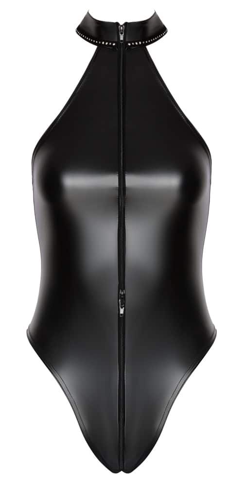 Betonender Body Libido Exclusive von Noir im schwarzen Powerwetlook – schmiegt sich an wie eine zweite Haut. Dabei weich und elastisch für maximalen Tragekomfort. Knapp geschnittener schulterfreier Style mit funkelnden Strasssteinen am Stehkragen. Der durchgehende 2-Wege-Reißverschluss verläuft vom Kragen durch den Schritt bis über den Po. Extra hohe Beinausschnitte setzen Po und Beine aufregend in Szene.