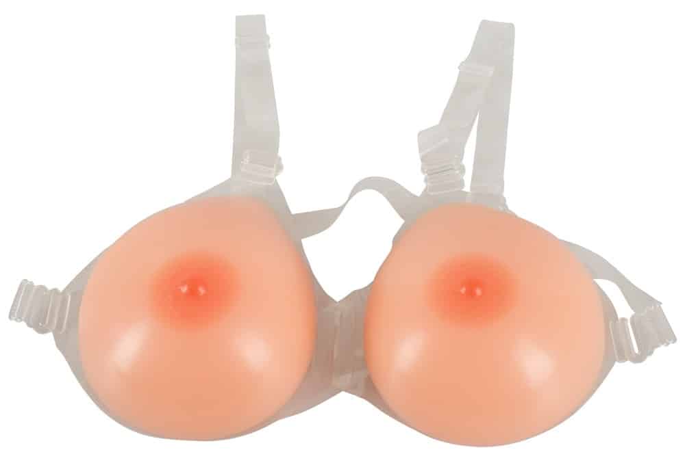 Silikonbrüste mit in lebensechter Optik und Haptik. Auf der Innenseite leicht vertieft, so dass dieser „Spezial-BH“ auch von Frauen mit kleinen Brüsten getragen werden kann. Träger verstellbar und abnehmbar.