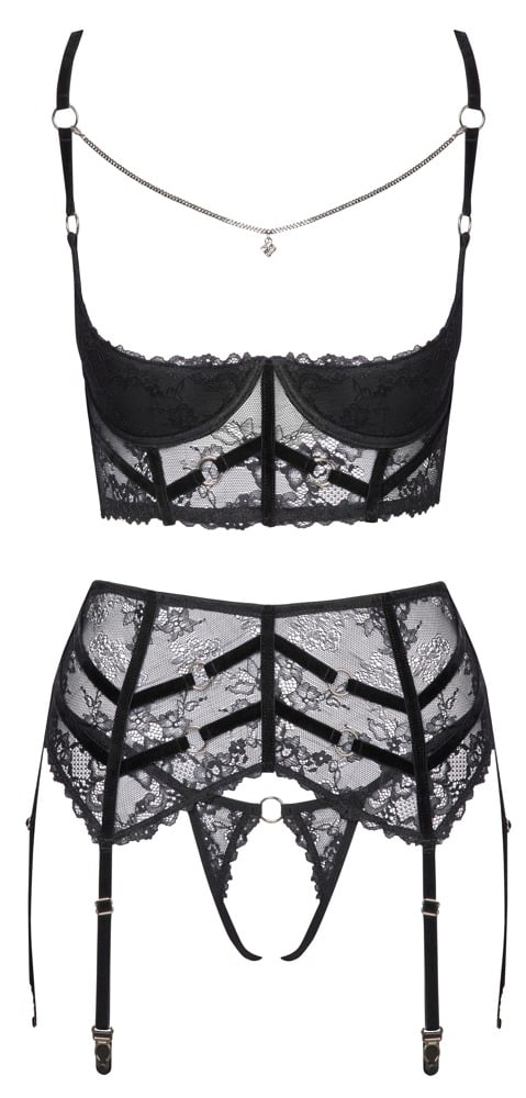 Longline-Hebe, Strapsgürtel und String ouvert vereint im elegant erotischen Set von Cottelli LINGERIE. Alles aus feiner weicher schwarzer Stretch-Spitze gearbeitet. Dekorativ mit Samtbändern und silberfarbenen Ringen verziert. Länger geschnittene Bügel-Hebe mit leicht gefütterten Cups. Im freien Dekolleté mit abnehmbarer Strass-Schmuckkette. Der Hakenverschluss im Rücken sowie die Samt-Träger sind passend verstellbar. Auch der breite Strapsgürtel ist im Rücken mit verstellbarem Hakenverschluss versehen. Die insgesamt 6 Samt-Strumpfhalter sind ebenfalls verstellbar. Der kleine String verführt mit einem offenem Schritt.