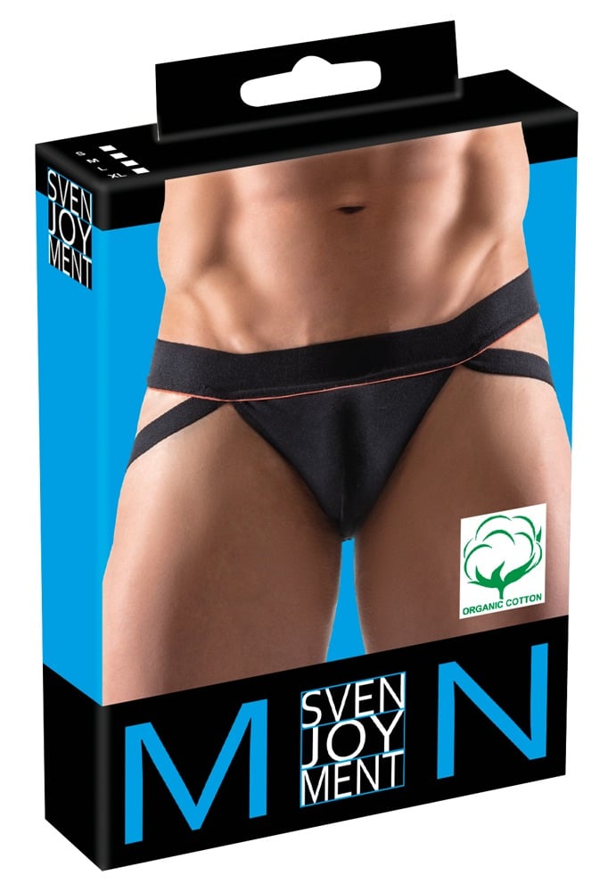 Schwarzer Jock von Svenjoyment mit rasantem roten Streifen unter dem weichen Webgummibund. Beutel doppellagig gearbeitet. Hoher Tragekomfort dank perfekter Passform und elastischer Organic Cotton Qualität – Oeko-Tex zertifiziert.