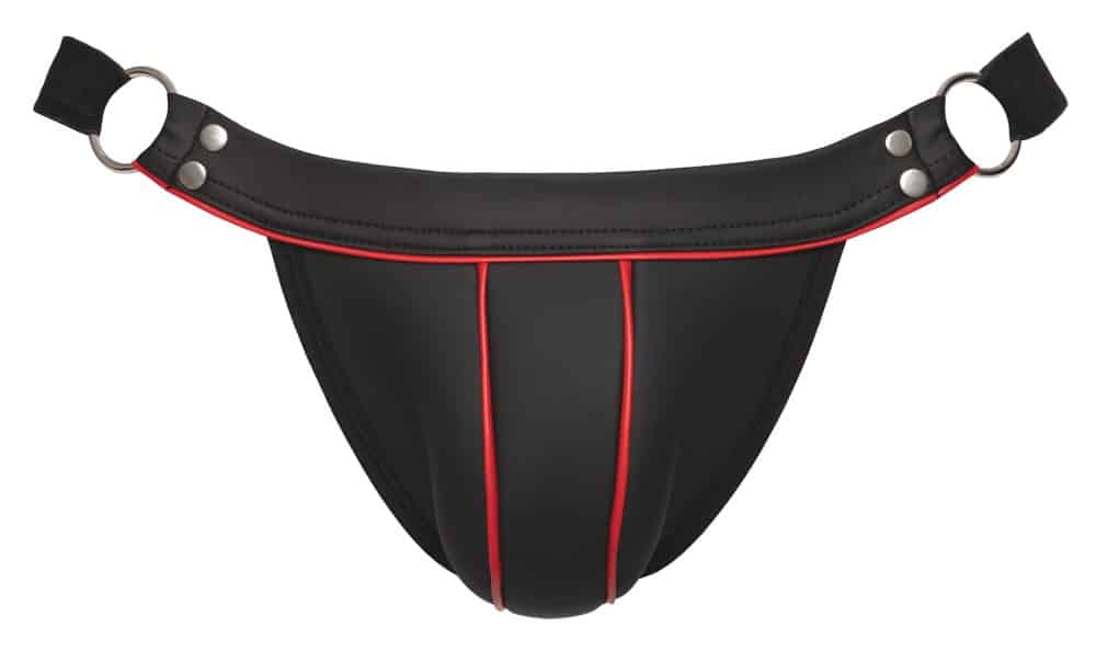 Aufregend po-freier Jockstring von Svenjoyment im trendigen schwarzen Mattlook, der optisch an Neopren erinnert. In der Front mit Biesen in Kontrastfarbe Rot als Eyecatcher. Schön weich und elastisch mit breiten Webriemen für perfekte bequeme Passform.