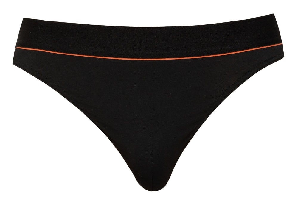 Schwarzer Riostring von Svenjoyment mit rasantem roten Streifen unter dem weichen Webgummibund. Beutel doppellagig gearbeitet. Hoher Tragekomfort dank perfekter Passform und elastischer Organic Cotton Qualität – Oeko-Tex zertifiziert.