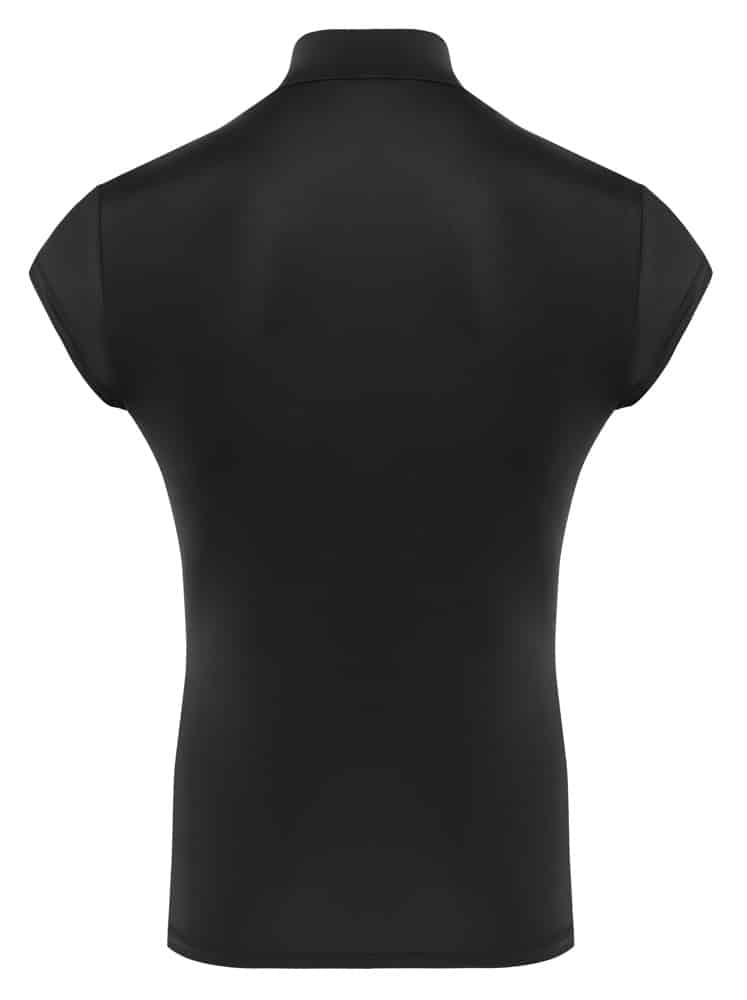 Betonendes Shirt von Svenjoyment mit kleinem Arm. Aus weicher schwarzer Mikrofaser mit transparenten Streifen-Einsätzen jeweils seitlich und auf den Schultern. Mit Stehkragen und kurzem Reißverschluss vorne. Rundum elastisch für maximalen Tragekomfort.