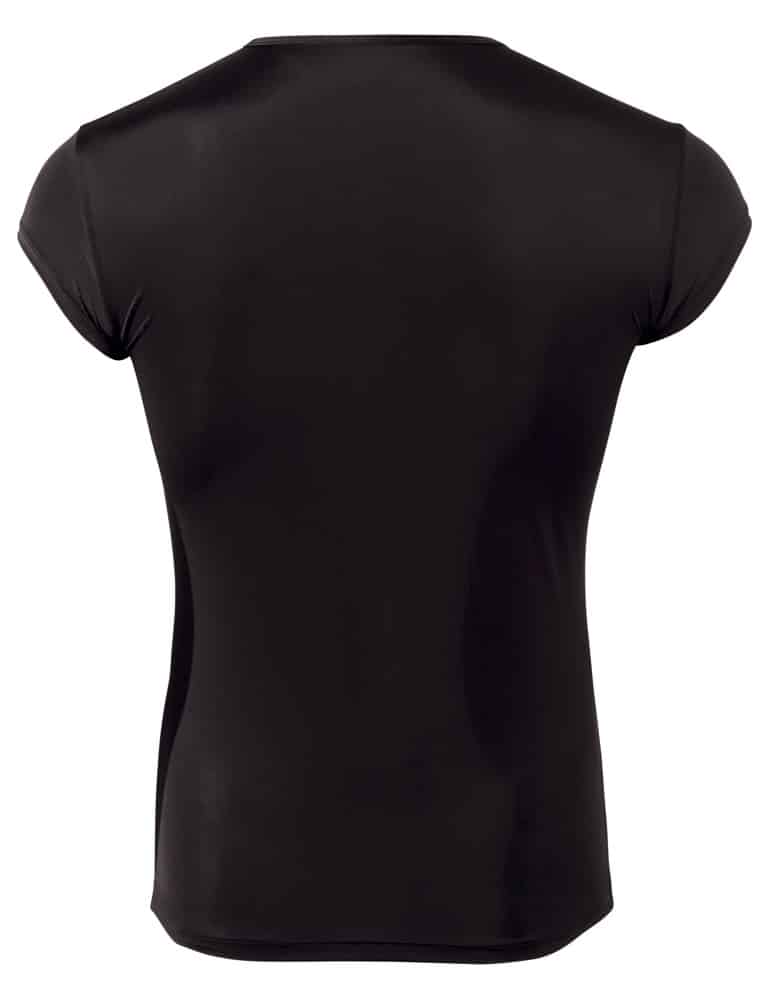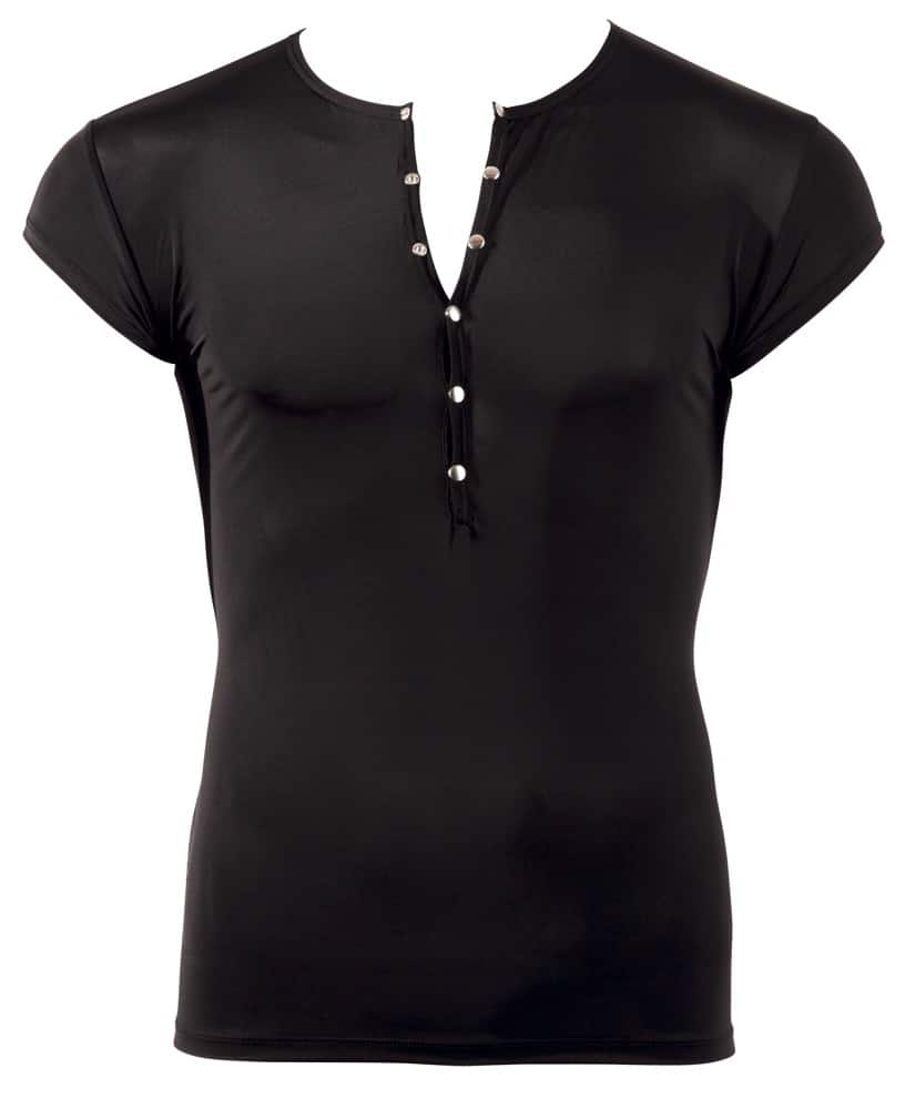 Leicht transparentes Shirt aus elastischer, hauchdünner Mikrofaser – kaum spürbar und herrlich bequem. Mit kurzem Arm und silberfarbener Druckknopfleiste vorne. Schwarz. 85% Polyamid, 15% Elasthan.