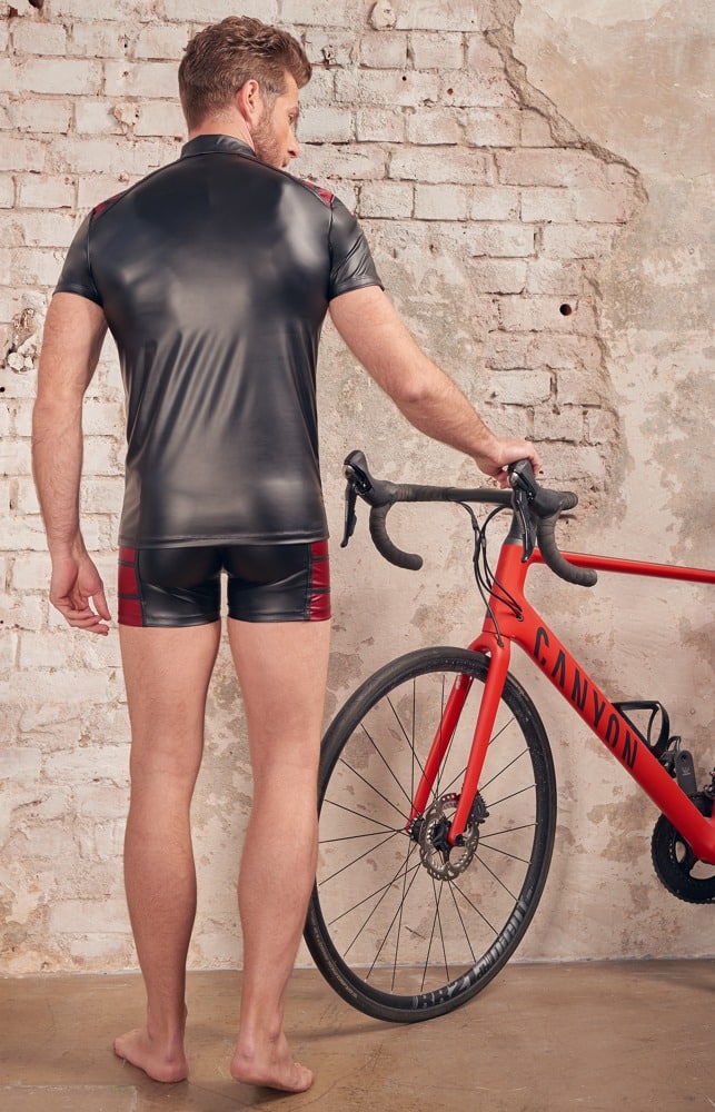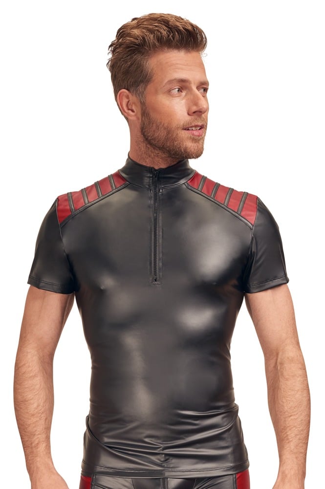 Schwarzes Shirt von NEK im trendigen Mattlook mit roten Streifen-Einsätzen auf der Schulterpartie. Mit kleinem Stehkragen und Reißverschluss vorne. Fantastisch elastisch für hervorragenden Tragekomfort.