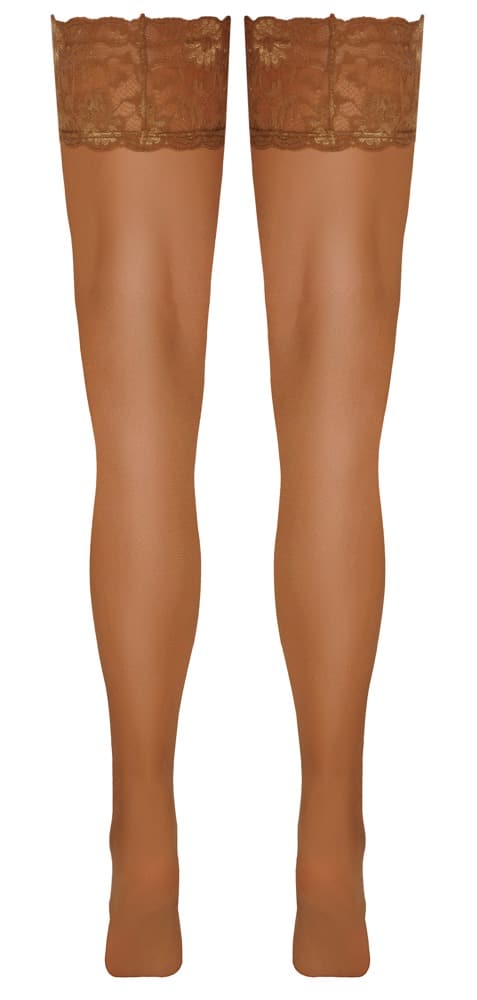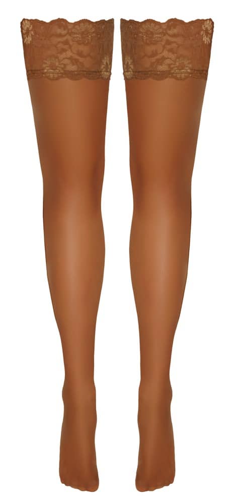 Halterlose, hautfarben helle Strümpfe von Cottelli LEGWARE mit schönem 9 cm breitem Spitzen-Abschluss. Innen mit Silikonverstärkung für rutschfesten Sitz und optimalen Halt. Garnstärke 20 den. Oeko-Tex zertifiziert.