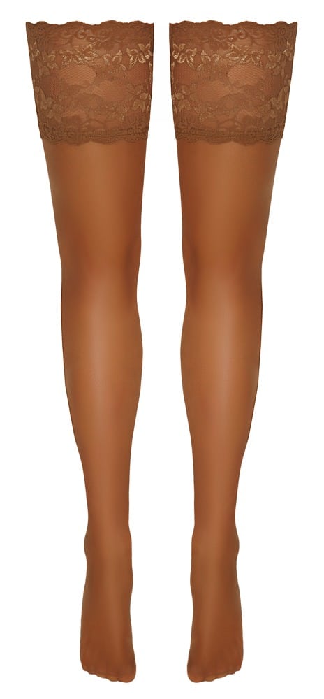 Halterlose, hautfarben helle Strümpfe von Cottelli LEGWARE mit schönem 14 cm breitem Spitzen-Abschluss. Innen mit Silikonverstärkung für rutschfesten Sitz und optimalen Halt. Garnstärke 20 den. Oeko-Tex zertifiziert.