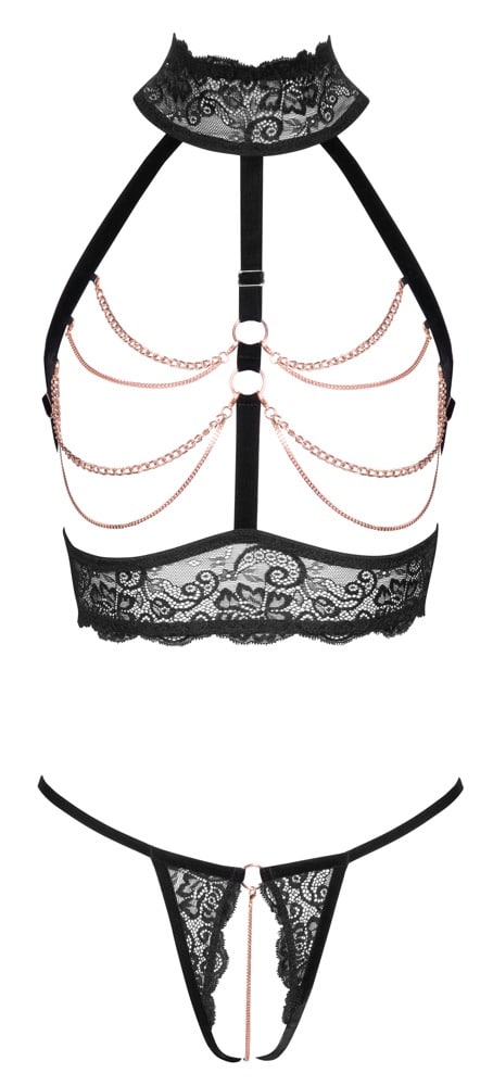 Aufregendes Ouvert-Set von Abierta Fina mit busenfreiem Top und schrittoffenem String. Schwarze weiche elastische Spitze, Samtbänder und roségoldfarbene Ketten setzen verführerisch in Szene! Ouvert-Top mit passend verstellbaren Samtbändern und -trägern. Auch der Hakenverschluss im Rücken ist passend verstellbar. Das Spitzen-Halsband als Neckholder wird mit 2 Knöpfen im Nacken geschlossen. Der String verführt mit stimulierender Kette im offenen Schritt, die auch abgenommen werden kann.