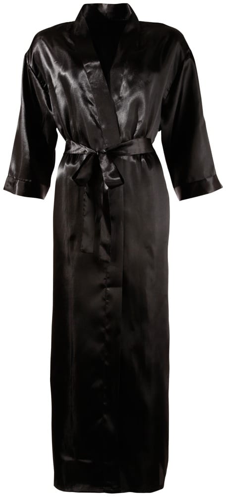 Langer schwarzer Kimono in weichfließender, glänzender Satin-Qualität – schmeichelt auch der etwas stärkeren Figur! Mit Bindegürtel. Ohne Taschen.