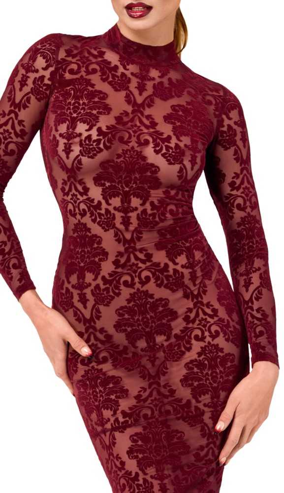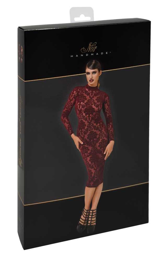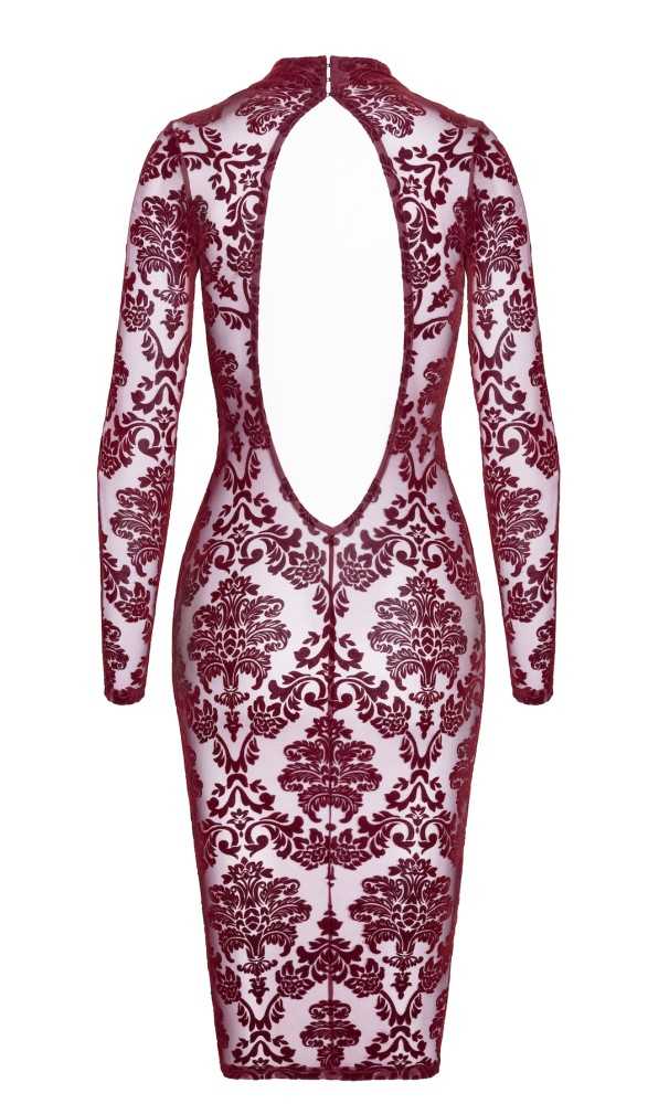 Mit seiner charakteristischen Länge bis knapp übers Knie bietet das Kleid genau die richtige Balance zwischen Zurückhaltung und Aufregung. Der hochgeschlossene Ausschnitt und die langen Ärmel verleihen dem Look eine formelle Note, während der spektakulär offene Rücken für den sinnlichen Überraschungseffekt sorgt. In Kombination mit dem intensiven Rotton entsteht ein Kleid, das sowohl glamourös als auch verführerisch wirkt.