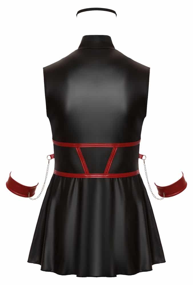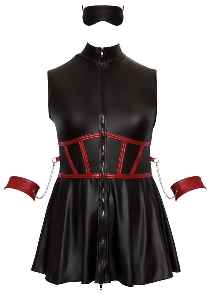 Ärmelloses kurzes Kleid von Cottelli BONDAGE PLUS in enger Schnittführung mit ausgestelltem Röckchen. Rundum elastisch und im edlen schwarzen Mattlook mit roten Kontraststreifen in taillenbetonender Mieder-Optik. Jeweils seitlich ein Ring für die beiden beiliegenden soften Armfesseln mit ihren Karabiner-Ketten. Die Fesseln sind mit Klettverschlüssen passend verstellbar. Vorne mit durchgehendem 2-Wege-Reißverschluss, der sich vom Stehkragen und dem Saum variabel öffnen lässt. Die leicht gepolsterte Augenmaske ist inklusive und absolut blickdicht fürs aufregende Spiel.