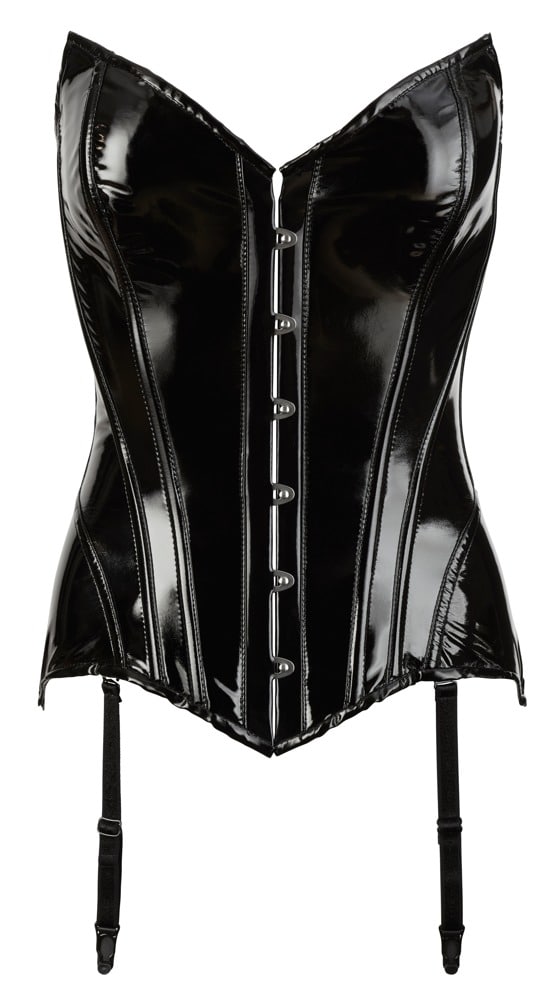 Diese sexy Corsage von Black Level aus schwarzem Lack ist ein erotischer Blickfang. Durch den extralangen Schnitt und die besondere Ausarbeitung an den Hüften werden alle Kurven aufregend betont, gleichzeitig modellieren die eingearbeiteten Formstäbe die Figur. Die Zierschnürung im Rücken vervollständigt den aufregenden Look. Mit dem Hakenverschluss in der Front lässt sich die Corsage einfach und schnell öffnen und schließen. Die 6 Strumpfhalter sind verstell- und abnehmbar.