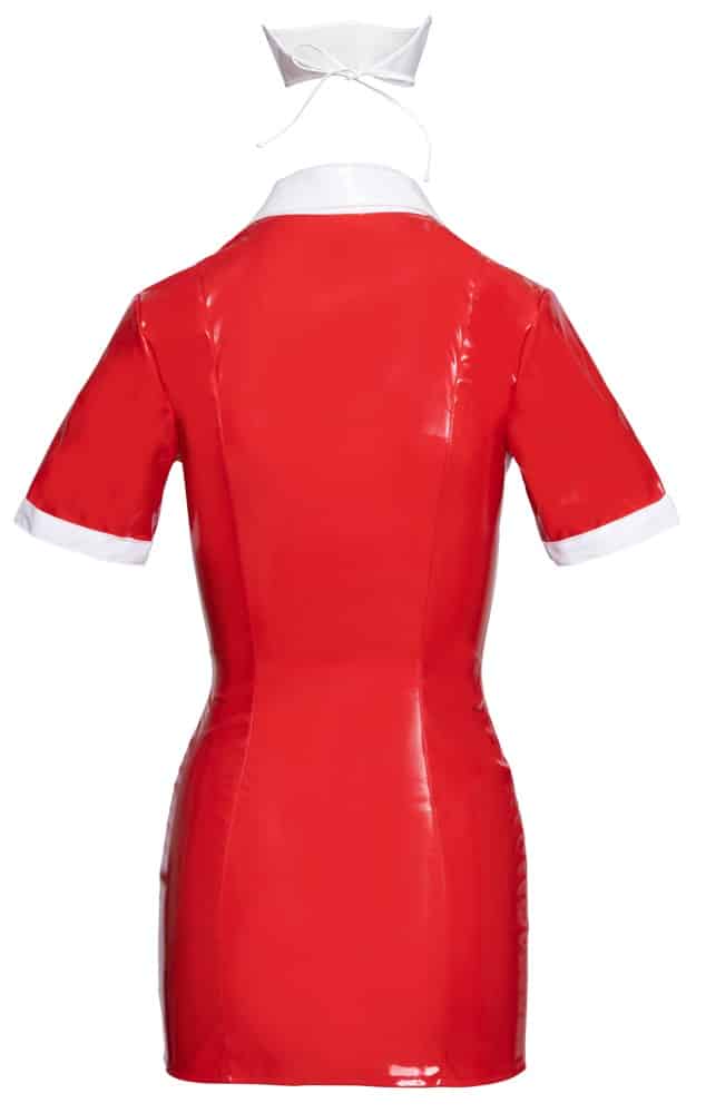 Kurzes Kleid von Black Level inklusive Haube. Halbarm-Kleid im roten Lackglanz mit weißen Kontrast-Details und schwarzem Kreuz-Emblem. In enger Schnittführung mit durchgehendem Reißverschluss vorne. Die weiße Lack-Haube zum Binden hat vorne ebenfalls ein Kreuz-Emblem.