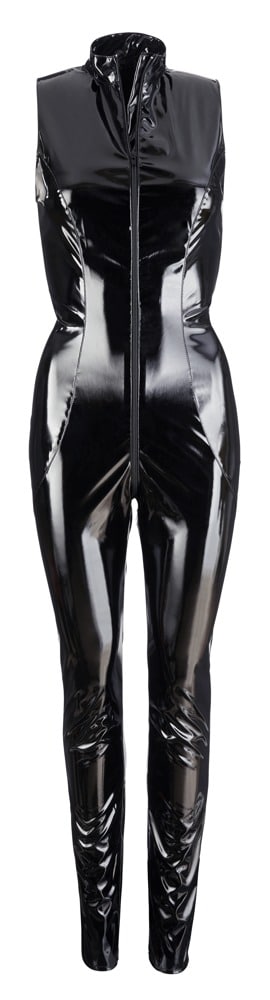 Ärmelloser Overall von Black Level komplett im schwarzen Lackglanz. In figurnaher Schnittführung mit langem schmalem Bein. Der Clou ist der praktisch-erotische 2-Wege-Reißverschluss, der vom Stehkragen durch den Schritt bis über den Po verläuft und sich von beiden Seiten schnell öffnen lässt.