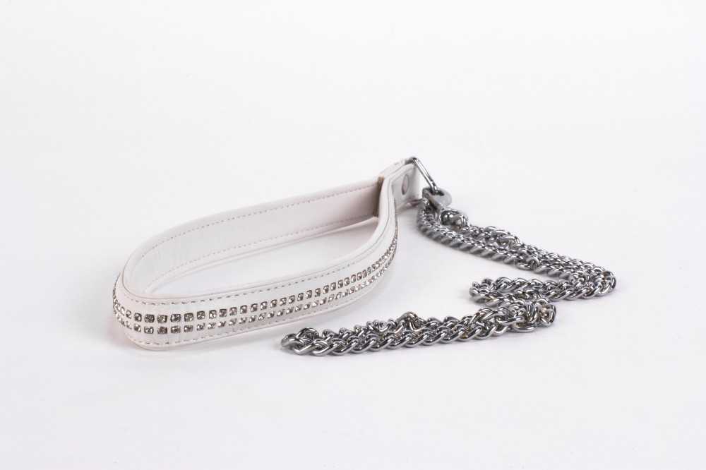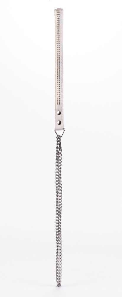 Die integrierte Metallleine misst 34 cm und bietet genug Spielraum für sanftes Führen oder intensivere Sessions. Die Kette lässt sich mühelos am Halsband befestigen und liegt angenehm in der Hand – sei es für ein dominantes Ziehen oder ein spielerisches Antippen. Der Griff ist ebenfalls aus weißem Lammleder gefertigt und liegt elegant in der Handfläche.