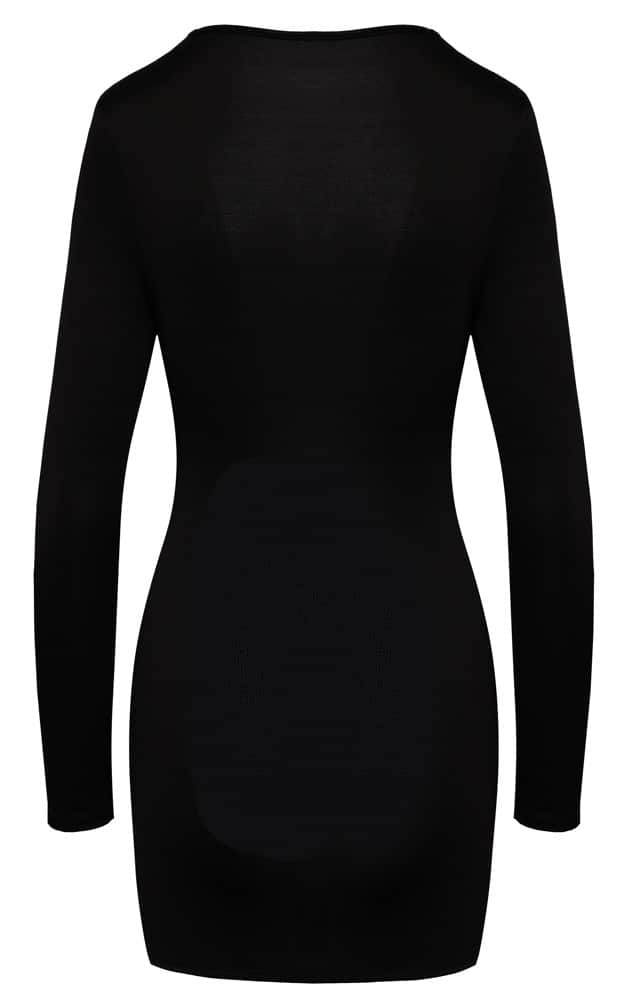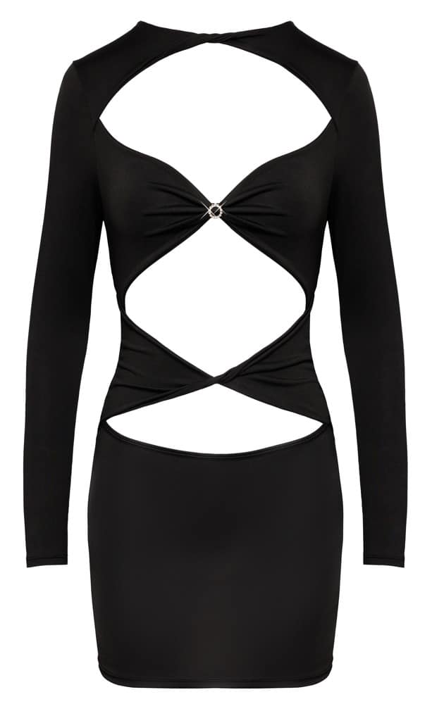 Enges kurzes Langarm-Kleid von Cottelli PARTY in weicher anschmiegsamer Stretch-Qualität. Aufregend zeigefreudige Front mit 3 gerafft-gedrehten Cut-outs. Ein glitzernder Strassring zwischen den Cups als zusätzlicher Eyecatcher. Hinten schlicht und schön.