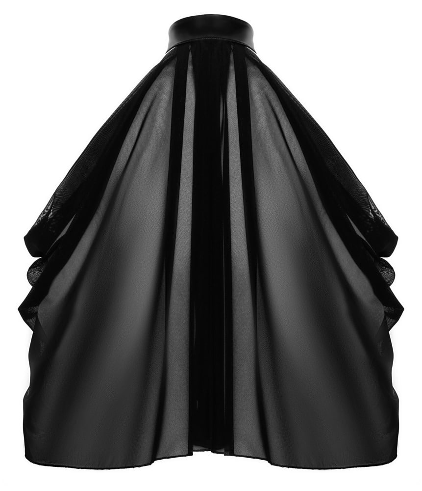 Luftig und weit geschnittenes Top Orgia von Noir komplett in feiner schwarzer Tüll-Transparenz. Schulterfreier Cape-Style mit Neckholder-Halsband im Powerwetlook, vorne mit Druckknopfverschluss. Asymmetrisch geschnitten: vorne kurz und offen, die Arme und den Rücken bedeckend.