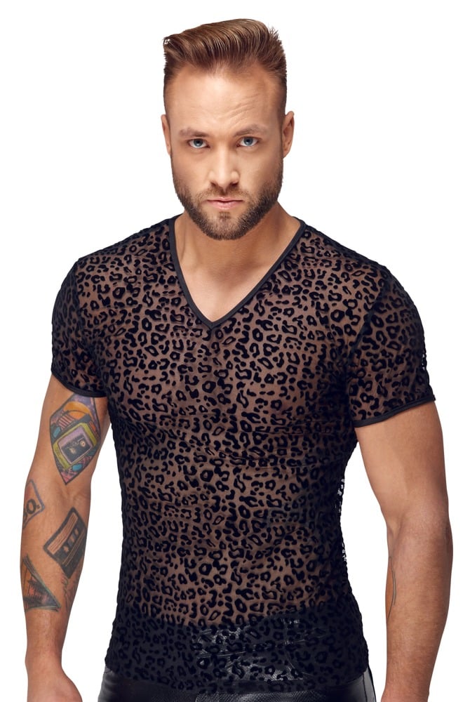 Betonendes Shirt von Noir aus feinem transparentem Powernet mit edlem Samtflockprint im Leo-Look. Rundum weich und elastisch für hohen Tragekomfort. Halber Arm und kleiner V-Ausschnitt sorgfältig eingefasst.