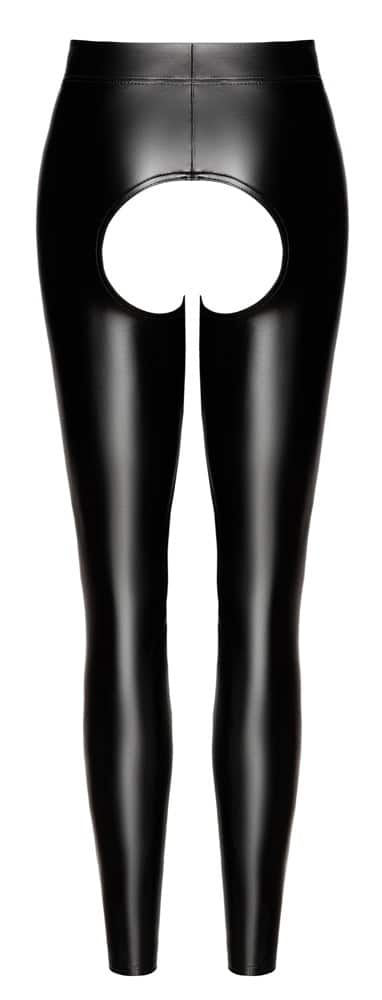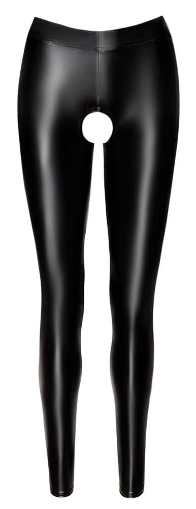 Anschmiegsame Leggings Libido von Noir mit hohem Taillenbund, einladend offenem Schritt und freiem Po. Im angesagten schwarzen Powerwetlook – weich und elastisch für hohen Tragekomfort.