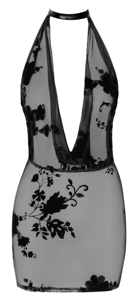 Schwarz-transparentes Minikleid Libido von Noir komplett aus feinem Stretchtüll mit floralem Samtflockprint. Rundum weich und elastisch für optimale Passform mit hohem Tragekomfort. In aufregend enger Schnittführung mit Halsband-Neckholder und extratiefem Wasserfall-Ausschnitt. Im freien Rücken mit Strass besetzter langer Kette bis zum Po.