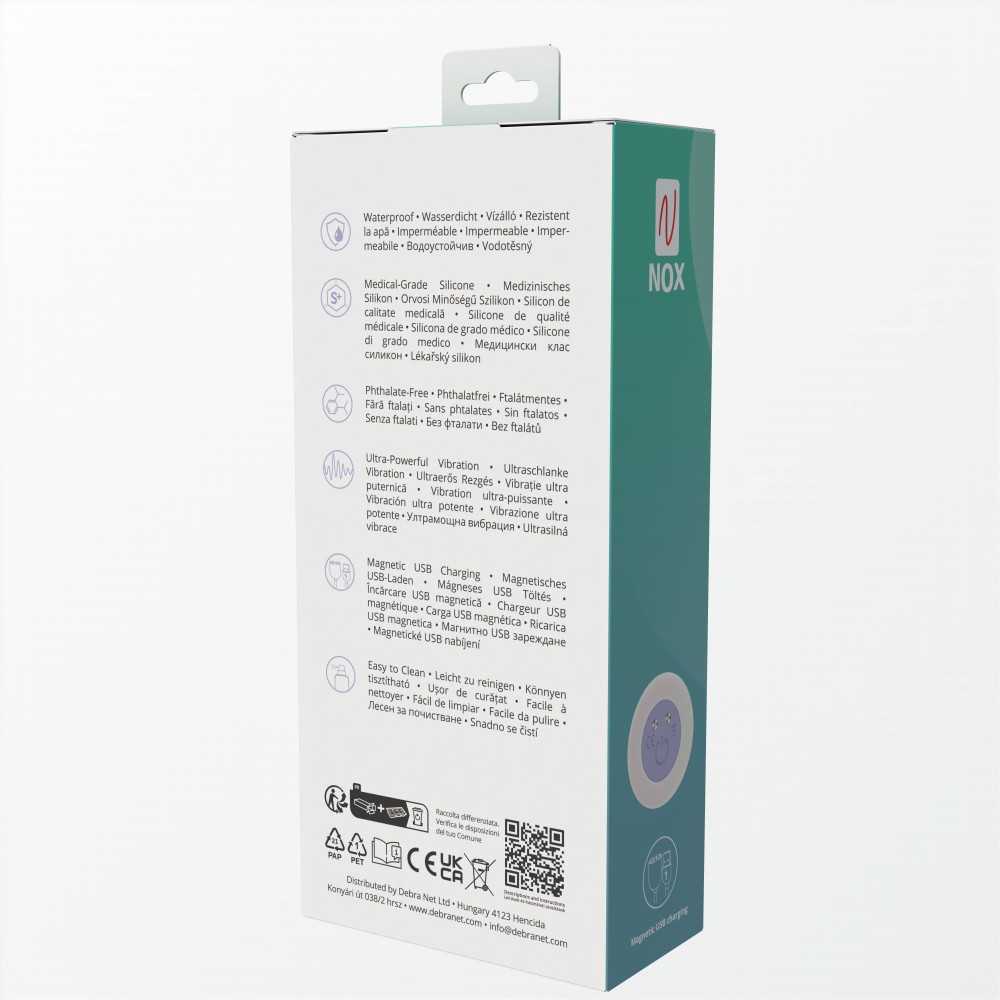 Das verwendete medizinische Silikon überzeugt durch seine besondere Hautfreundlichkeit, Langlebigkeit und einfache Pflege. Die seidige Oberfläche gleitet sanft über die Haut und intensiviert das sinnliche Erlebnis. Da der NOX Lyza Vibrator frei von Weichmachern ist, bietet er höchste Sicherheit in der Anwendung.