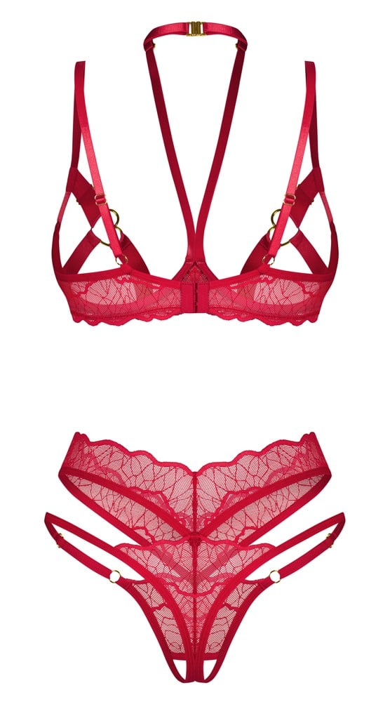 Ouvert-Set Cupide Desir von Obsessive mit BH und String. Filigrane Spitzen-Optik in sinnlichem Rot mit goldfarbenen Details. Weich und elastisch für hohen Tragekomfort. BH mit modischem, verstellbarem Neckholder. Zwischen den offenen Cups mit dezentem Schmuckdetail. Die Cup-Riemen mit den Schmuckherzen für die Nippel sind z. T. verstellbar. Auch die Träger sind passend verstellbar. Der aufwendige String verführt mit stylischem Doppelbund. Die schmalen Seitenriemen sind verstellbar. Im Schritt verführerisch offen.
