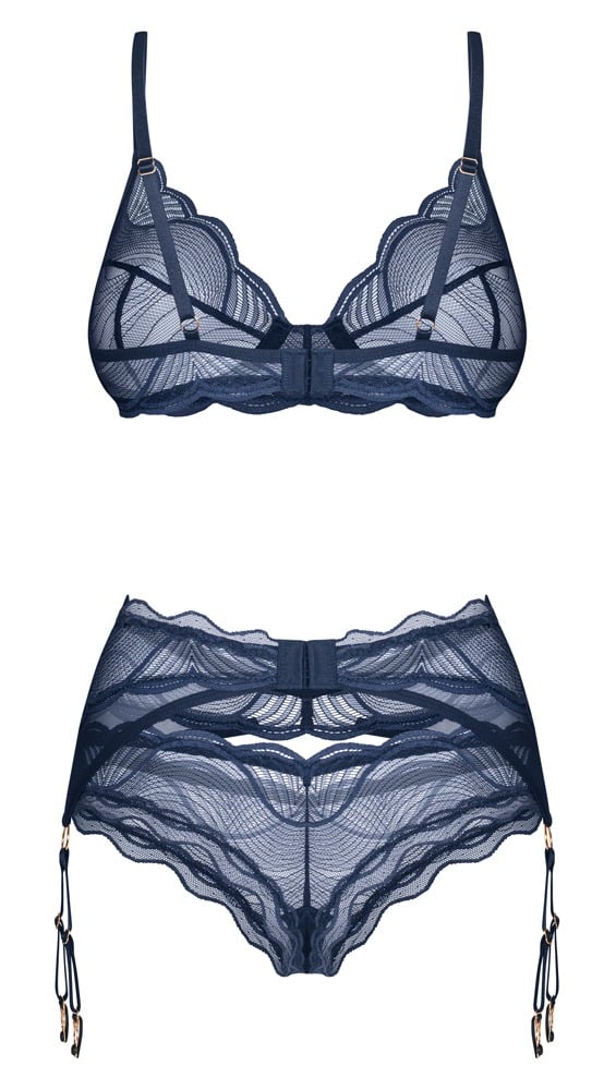 Transparentes Set Nightly Blue von Obsessive mit Bügel-BH, Strapsgürtel und String. Filigrane Spitzen-Optiken in noblem Blau-in-Blau. Rundum weich und elastisch für hohen Tragekomfort. BH und Strapsgurt mit verstellbarem Hakenverschluss im Rücken. Die Träger und Strumpfhalter sind ebenfalls passend verstellbar.