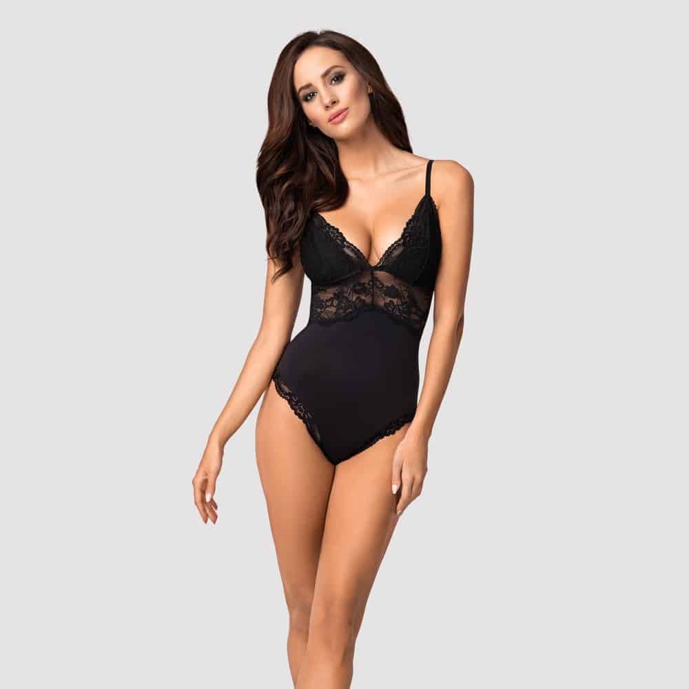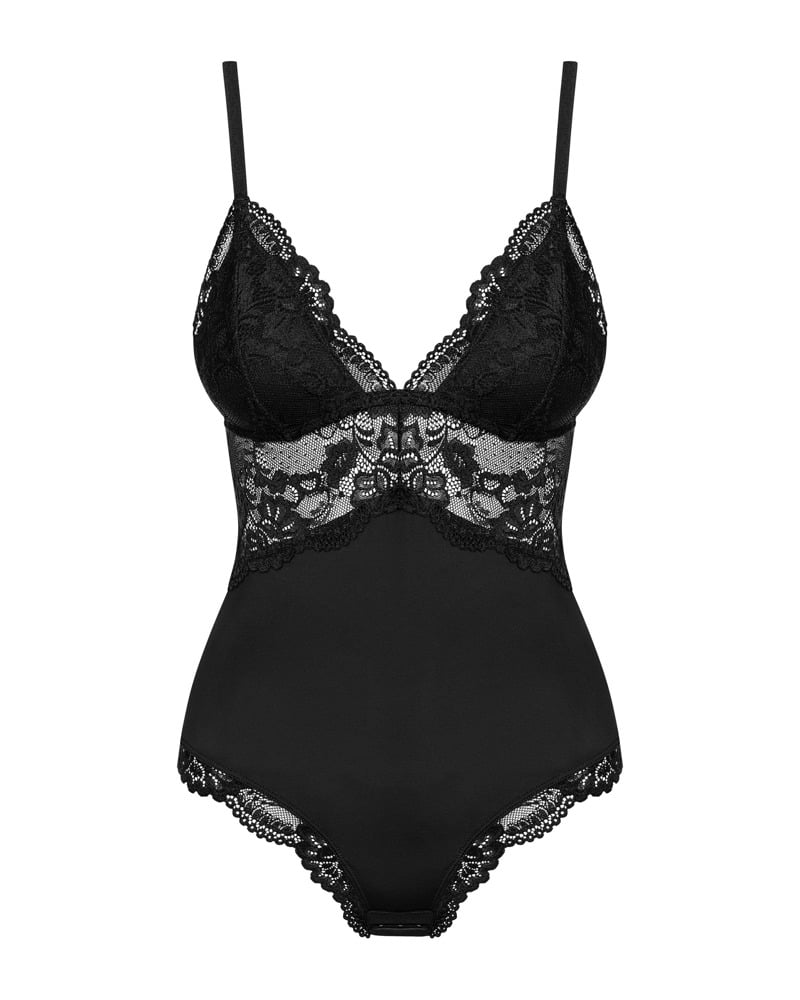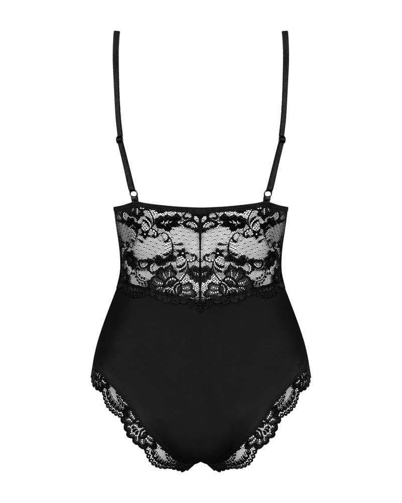 Bildschöner schwarzer Body 810-TED-1 von Obsessive aus weichem Stretchmaterial in Kombination mit feiner elastischer Spitze. Hoher Tragekomfort! Spitzen-Cups blickdicht gepolstert. Die Träger sind passend verstellbar. Im Schritt mit Hakenverschluss.