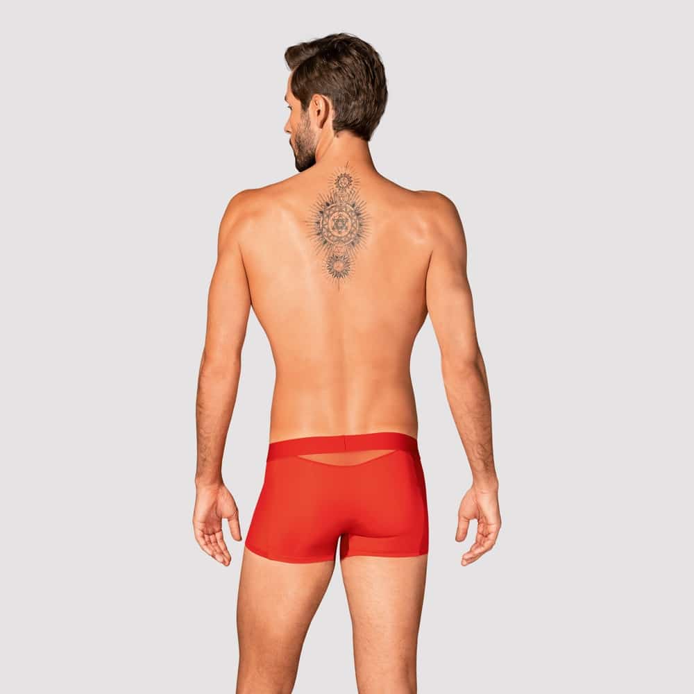 Rote Pants Boldero von Obsessive mit transparenten Einsätzen jeweils seitlich und hinten. Rundum weich und elastisch für hohen Tragekomfort. Bequemes Bundgummi mit kleinem Metall-Element vorne.