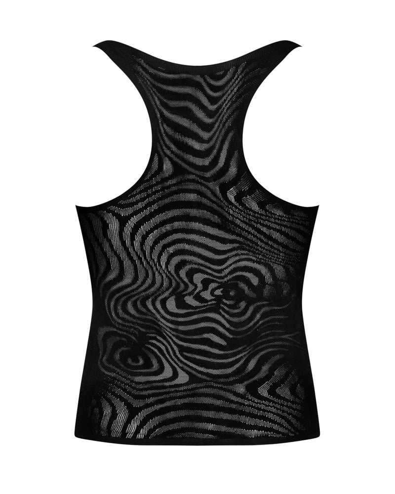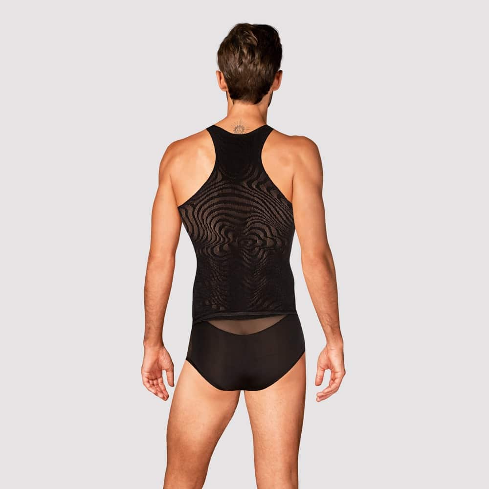 Ärmelloses schwarzes Shirt T103 von Obsessive im körperbetonenden Tank Top Style. Aufregend transparent und mit eingewebtem attraktivem Trendmuster. Weich und elastisch für hohen Tragekomfort.