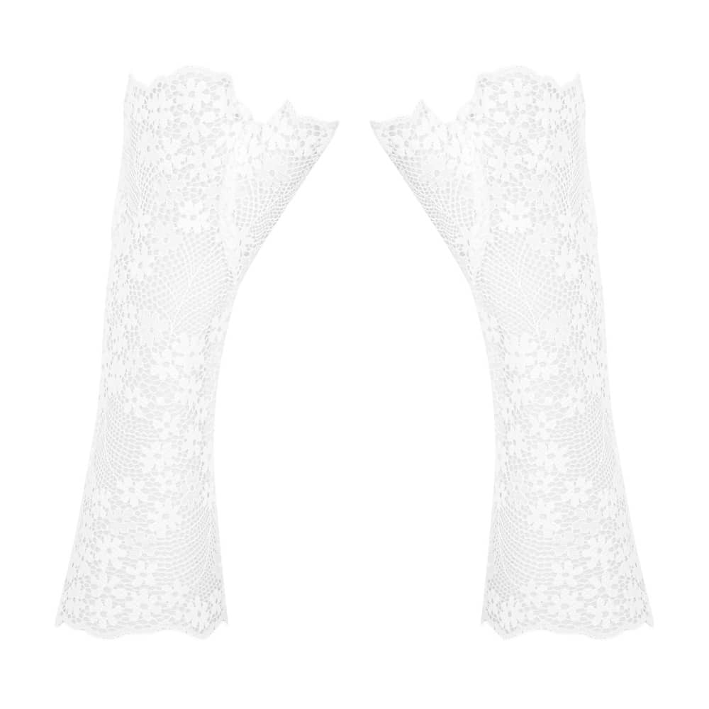 Weiße Handschuhe Heavenlly von Obsessive aus weicher elastischer Blütenspitze. Die kurzen Armstulpen sind nur mit Daumen gearbeitet. Das besondere Extra zu vielen Outfits!