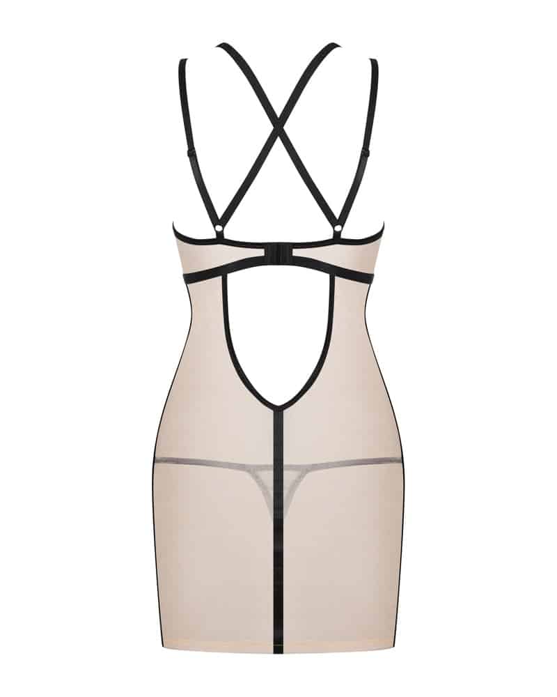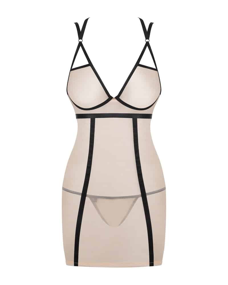 Du wirst dich in deinem neuen Hemd wie im Himmel fühlen! Und du wirst seine Göttin sein. Aber der Teufel steckt im Detail. Neugierig? Frivol durchscheinendes Material, außergewöhnlich schöne, schimmernde, goldene Fäden, die in das Material eingewebt sind, eine faszinierende Kombination aus Trägern und einer nudefarbenen Farbe. Stellen Sie sich den Morgen nach einer heißen Nacht vor, wenn Sie mit diesem Hemd aufwachen…