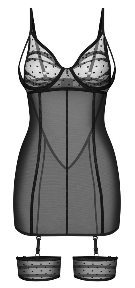 Eng anliegendes Negligé Nuites von Obsessive mit Strapsen vorne und Strumpfbändern. Verführerischer Style in nobler schwarzer Transparenz, modische Punkte setzen stylische Akzente. Rundum weich und elastisch für hohen Tragekomfort. Negligé mit dezentem Schmuckdetail zwischen den soften Cups. Die Träger und der Hakenverschluss im freien Rücken sind passend verstellbar. Die verstellbaren Strapse mit den Strumpfbändern sind vom Negligé abnehmbar.