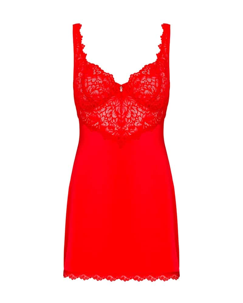 Figurbetonendes Dessouskleid und String im roten Set Amor Cherris von Obsessive. Seidiger Stretchsatin mit einem Oberteil aus schöner Spitze sowie Spitzensaum. Im Rücken mit BH-Hakenverschluss. Die Träger sind passend verstellbar.
