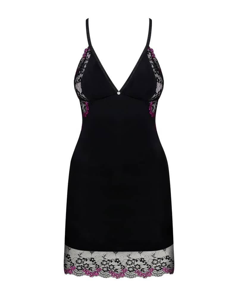 Figurbetonendes Dessouskleid und passender String im Set Vanessme von Obsessive. Im raffinierten Mix aus blickdichtem schwarzem Stretchmaterial und transparenter 2-farbiger Spitze. Alles weich und elastisch für vollen Tragekomfort. Mit soften Cups und Hakenverschluss hinten gearbeitet. Die Träger kreuzen sich im freien Rücken und sind passend verstellbar.