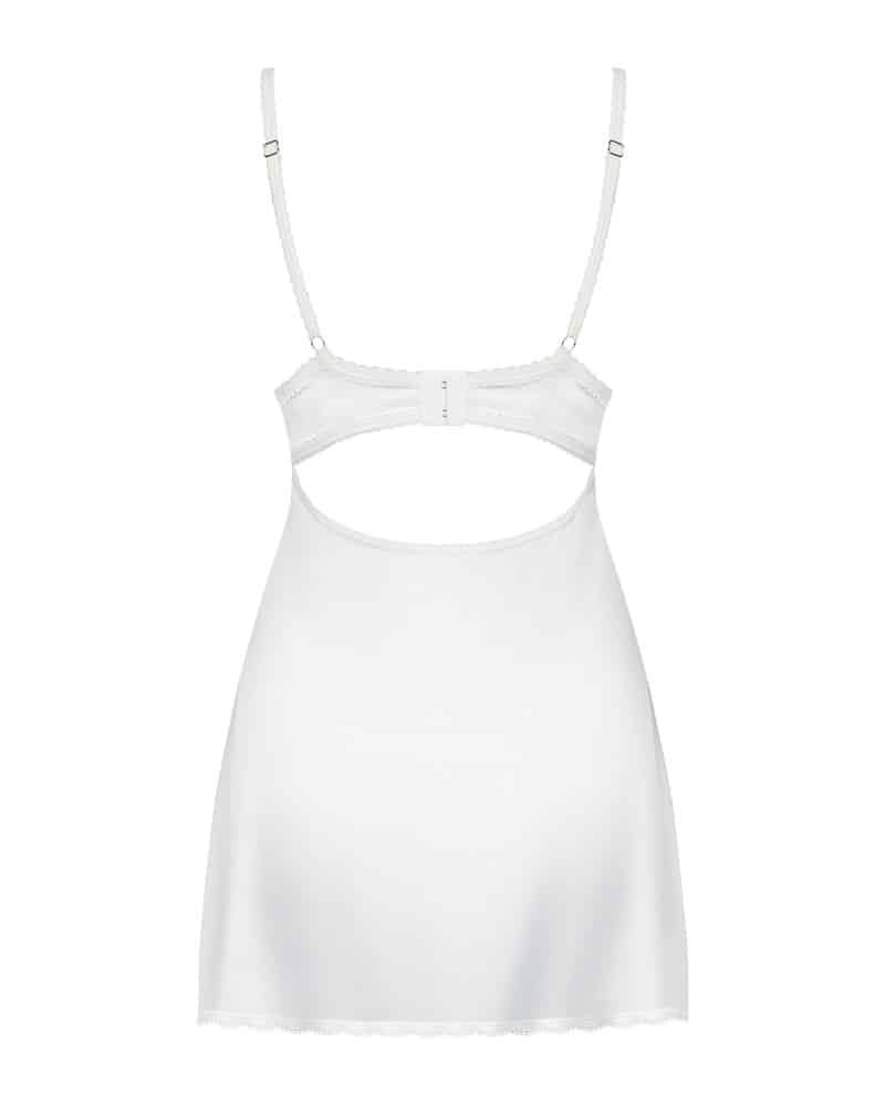 Figurbetontes weißes Dessouskleid und passender String im Set 871-CHE-2 von Obsessive. Aus seidigem Satin mit Spitzen-Details. Zwischen den Bügel-Cups verzaubert eine kleine Satinschleife und ein Schmuckelement. Die Träger sind passend verstellbar, genauso wie der Hakenverschluss im freien Rücken.