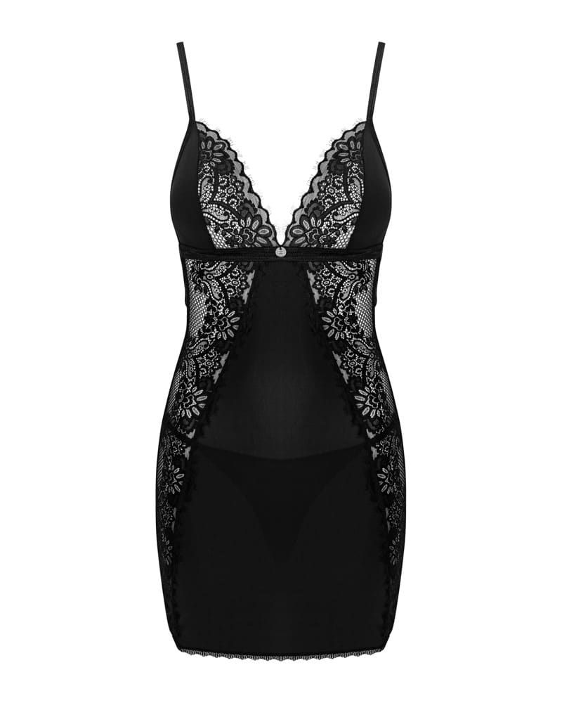 Figurbetonendes Dessouskleid und String im schwarzen Set Maderris von Obsessive. Weich und elastisch mit schöner Spitze an Cups und Seiten sowie im Rücken. Hinten mit BH-Hakenverschluss. Die Träger sind verstellbar.
