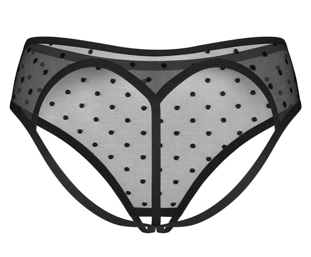 Panties ouvert Nuites von Obsessive im verführerischen Style. Noble schwarze Transparenz mit stylischen Pünktchen. Rundum weich und elastisch für hohen Tragekomfort. Mit dezentem Schmuckdetail vorne am breiten Bund. Im Schritt verführerisch offen.