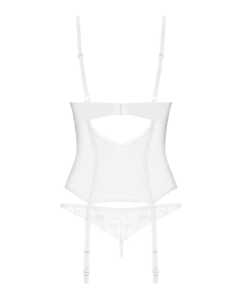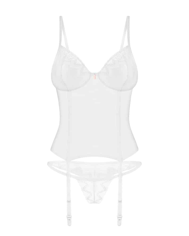 Transparentes Dessous-Set Alissium von Obsessive mit Strapshemd und String. Zarter Tüll mit Strukturspitze und in charmanter Farbe: Zeitloses Weiß. Rundum weich und elastisch für hohen Tragekomfort. Zwischen den soften Spitzen-Cups mit dezentem Schmuckdetail. Die Träger und der Hakenverschluss im Rücken sind passend verstellbar, genauso wie die Strumpfhalter. Der knapp geschnittene Spitzen-String komplettiert den sinnlichen Verführ-Look.