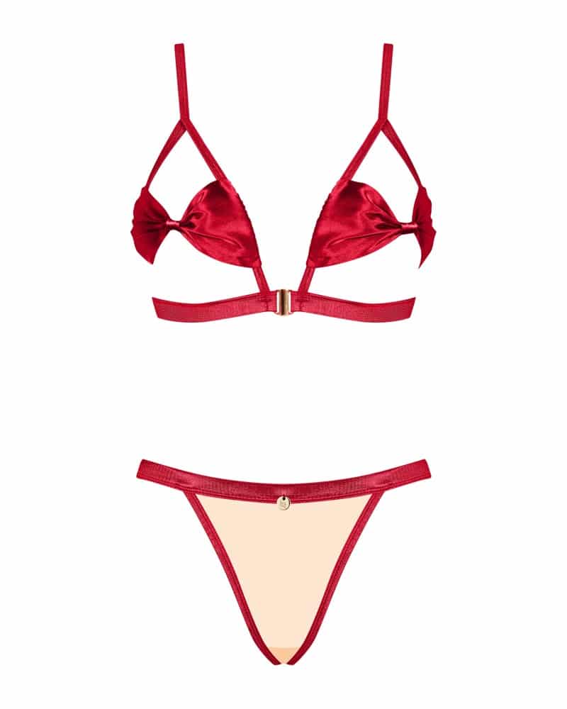 Soft-BH und String im Set Rubinesa von Obsessive aus rotem Satin mit goldfarbenem Schimmer. Offene BH-Cups sowie über dem Po mit dekorativer Satinschleife. BH mit Vorderverschluss und passend verstellbaren Trägern. Nudefarbener String aus weichem Stretchmaterial mit roten Kontrasten.