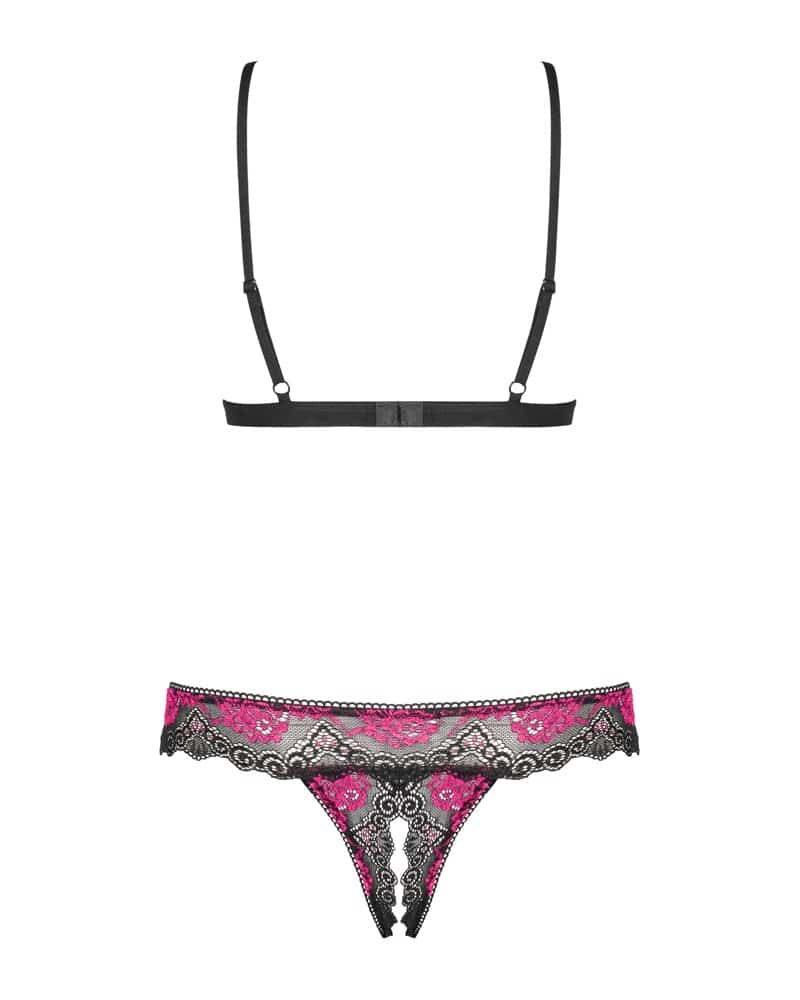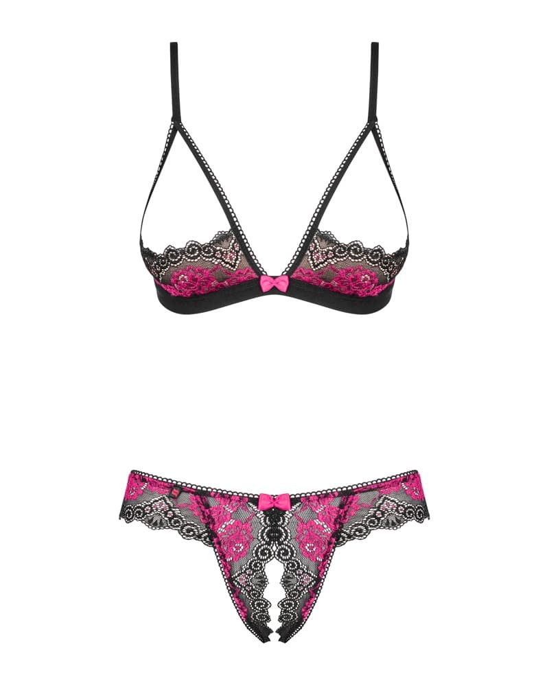 Ouvert-Set Tulia von Obsessive mit Soft-BH und String. Aus bildschöner 2-farbiger Spitze in Schwarz und Pink – rundum weich und elastisch für hohen Tragekomfort. Zwischen den offenen Cups und am Bund des schrittoffenen Strings mit kleinen Schleifchen verziert. Die BH-Träger sowie der Hakenverschluss im Rücken sind passend verstellbar.