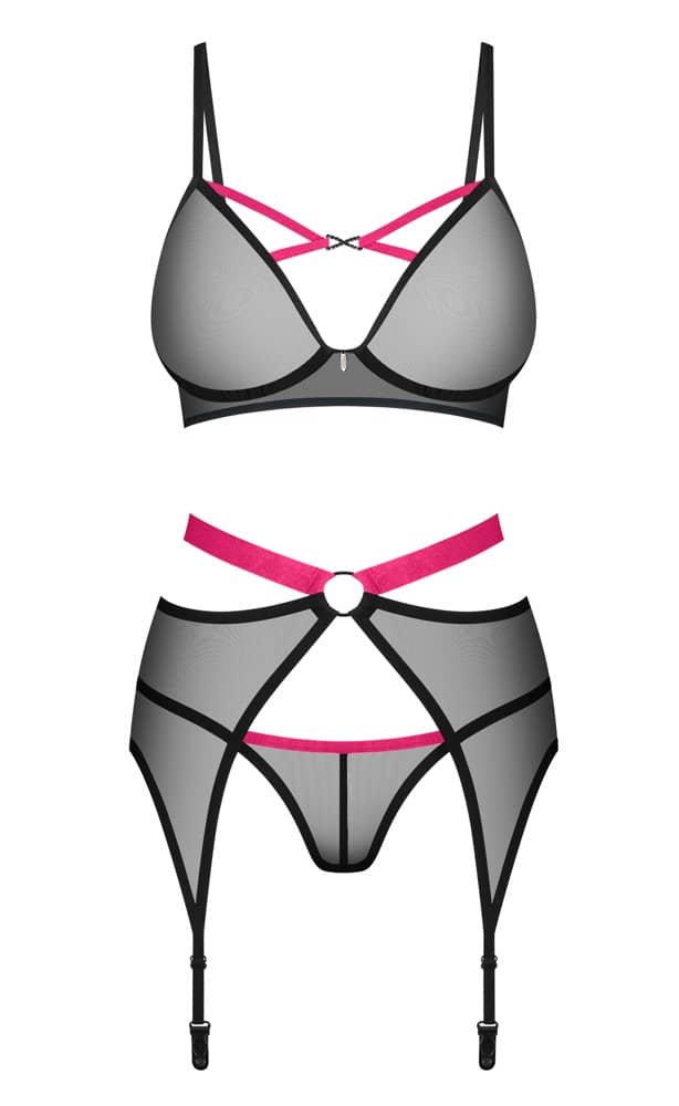 3-teiliges Straps-Set Novenes von Obsessive mit Soft-BH, Strapsgürtel und V-String. Aus feinem schwarzem Powernet mit pinkfarbenen Akzenten. BH mit Dekolleté-Riemchen und schönem Strasselement zwischen den soften Cups. Die Träger sind passend verstellbar. Genauso wie der Hakenverschluss im Rücken. Der schöne Strapsgürtel verführt mit kontrastfarbigem Taillenbund und Ring vorne. Im Rücken mit verstellbarem Hakenverschluss und auch die Strumpfhalter sind passend verstellbar. Der dazu passende V-String komplettiert dieses elegante Transparent-Trio.