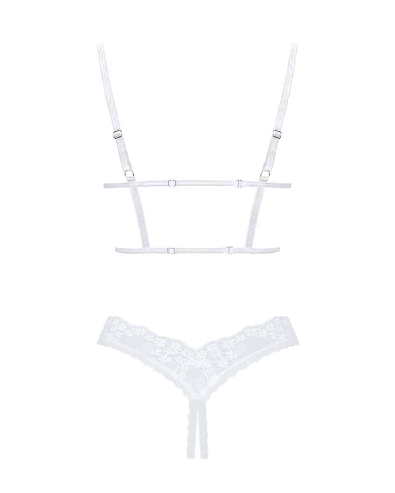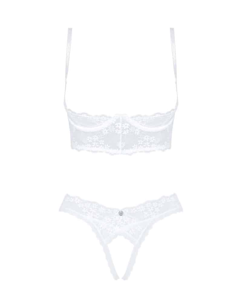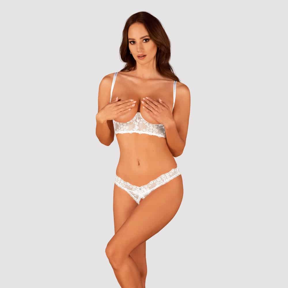 Hebe-BH und String als weißes Ouvert-Set Heavenlly von Obsessive. Aus weicher elastischer Blütenspitze. Eingearbeitete Cup-Bügel heben und stützen den freien Busen. Im Rücken mit zwei verstellbaren Riemchen. Auch die Träger sind passend verstellbar. Der String ist im Schritt verführerisch offen.