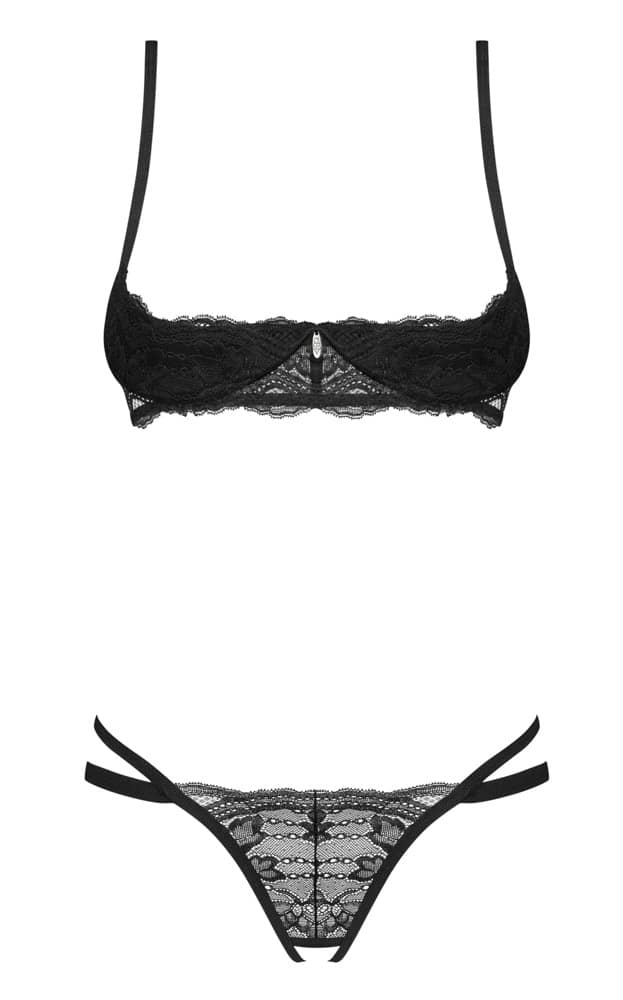 Schwarzes Ouvert-Set Nutris von Obsessive mit Bügel-Hebe und String ouvert. Aus bildschöner weicher Stretch-Spitze. Die Bügel-Hebe stützt den freiliegenden Busen perfekt. Das Schmuckelement zwischen den Cups fängt den Blick. Der Hakenverschluss im Rücken und die Träger sind passend verstellbar. Der schöne Spitzen-String ist im Schritt verführerisch offen.