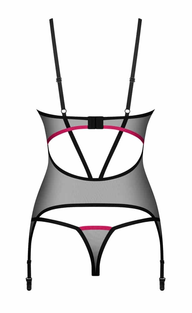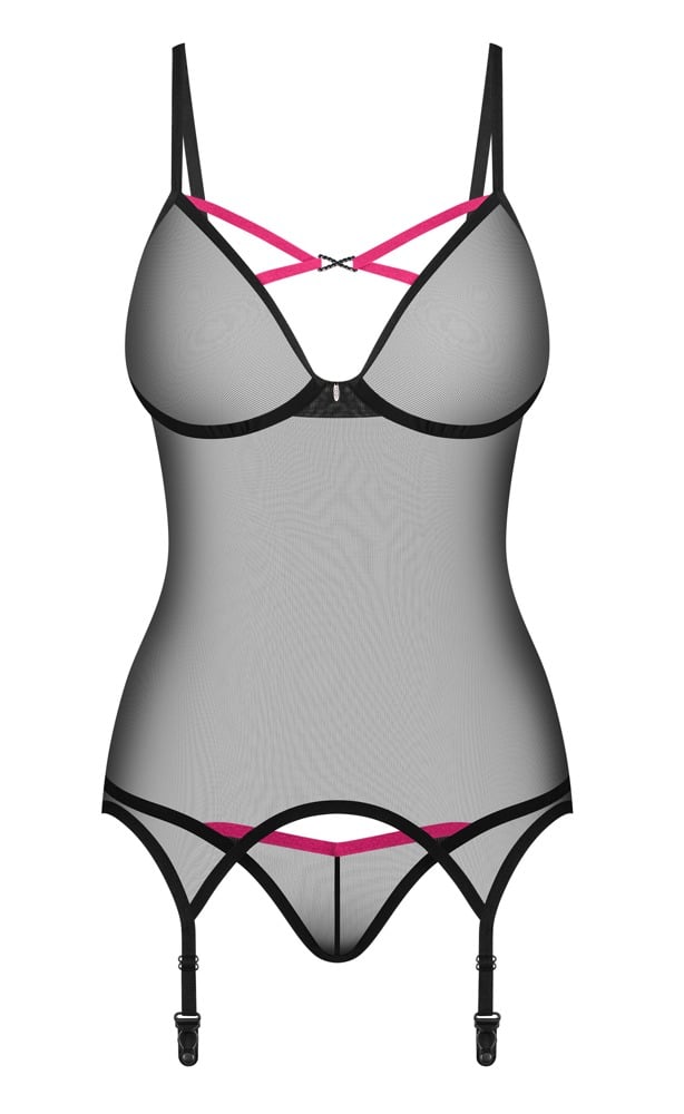 2-teiliges Straps-Set Novenes von Obsessive mit Strapshemd und String. Aus feinem schwarzem Powernet mit pinkfarbenen Akzenten. Mit Dekolleté-Riemchen und schönem Strasselement zwischen den soften Cups. Die Träger und Strumpfhalter sind passend verstellbar. Genauso wie der Hakenverschluss im freien Rücken. Der kleine String komplettiert dieses elegante Transparent-Set.